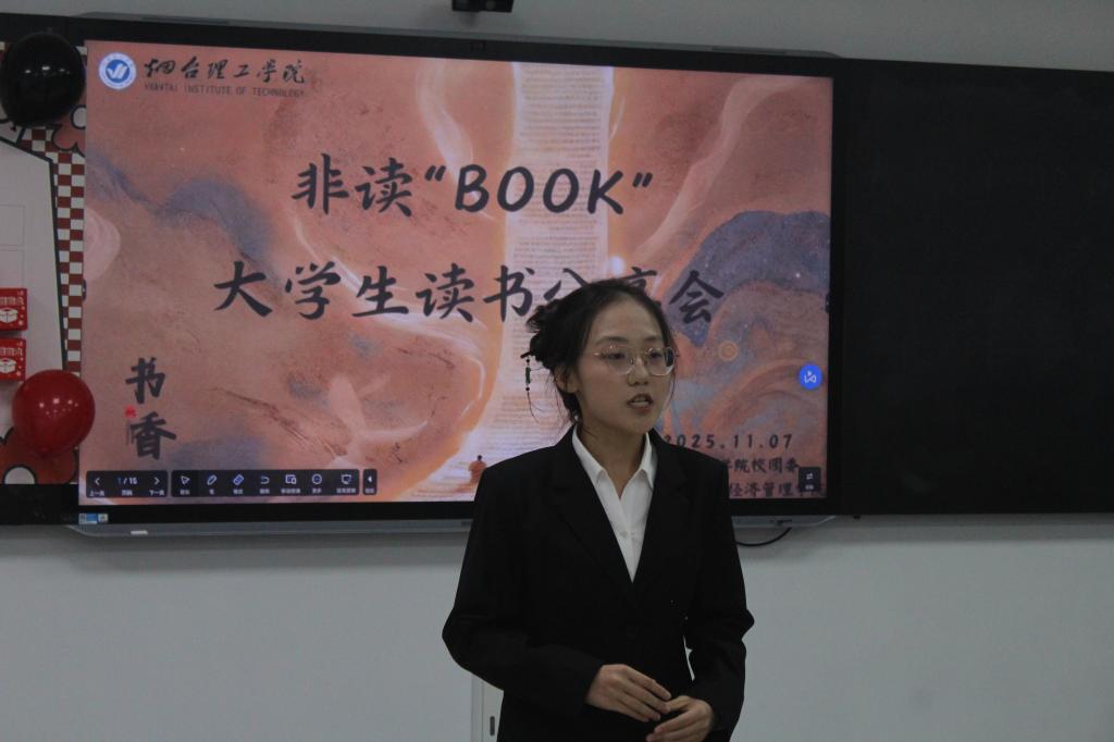 为推进书香校园建设,拓展学生精神视野,11月7日,烟台理工学院“非读BOOK”大学生读书分享会在综合教学楼智慧教室开展。活动由校团委主办、经济管理学院承办,吸引全校多个学院学子参与,各院代表以书为媒共享阅读感悟,上演了一场思想与心灵的交流。